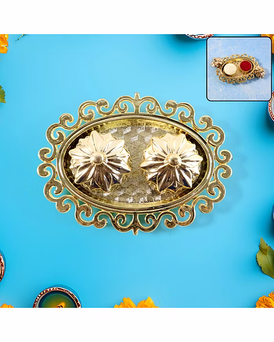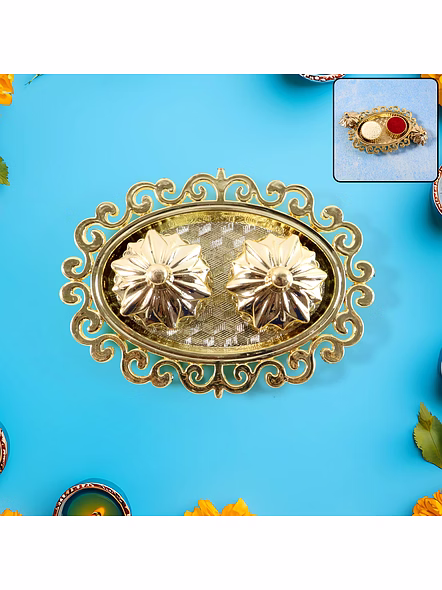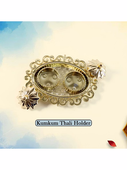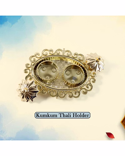 Decorative Double Kumkum Dish with Ornate Tray – Golden Plastic Pooja Accessory for Tilak, Roli, and Chandan Storage (1 Pc) Description :- Add elegance and devotion to your prayer setup with this beautifully crafted golden Plastic kumkum box with tray. Designed with intricate floral carvings, it includes two detachable containers for storing kumkum, roli, chandan, or haldi. The embossed oval tray with an ornamental border enhances the traditional look, making it ideal for pooja thalis, festive rituals, or as a decorative accent for your mandir. Compact yet eye-catching, this piece combines spiritual utility with artistic craftsmanship—perfect for gifting or personal devotion. Key Features :- Elegant dual design: Two individual boxes for kumkum and roli with a decorative floral lid. Premium finish: Crafted from durable Plastic with a radiant gold coating for long-lasting shine. Intricate craftsmanship: Ornate border and textured base add a touch of luxury to your pooja setup. Multipurpose use: Ideal for storing kumkum, roli, haldi, chandan, sindoor, or dry pooja items. Perfect décor element: Blends spirituality with aesthetics; suitable for festivals and home décor. Easy to clean: Wipe with a soft dry cloth to retain its lustrous shine. Ideal For :- Daily pooja rituals and festive worship ceremonies Gifting during Diwali, Navratri, Raksha Bandhan, weddings, or housewarmings Enhancing the look of traditional pooja thalis and mandirs Decorative use for spiritual corners, temples, or display units Specifications :- Product Type: Decorative Double Kumkum Box with Tray Material: Plastic with gold-tone finish Design: Floral engraved pattern with twin removable containers Use Case: For kumkum, roli, haldi, chandan, or pooja essentials Care Instructions: Wipe gently with dry or slightly damp cloth; avoid water exposure Keywords :- Decorative Kumkum Dish,Ornate Pooja Tray, Golden Plastic Pooja Accessory, Tilak Holder, Roli Chandan Dish, Kumkum Roli Container, Pooja Thali Accessory, Traditional Tilak Dish,Decorative Pooja Container,Indian Ritual Accessory, Golden Kumkum Plate, Festive Pooja Item, Temple Accessory DishDimension :- Volu. Weight (Gm) :- 63 Product Weight (Gm) :- 27 Ship Weight (Gm) :- 63 Length (Cm) :- 12 Breadth (Cm) :- 11 Height (Cm) :- 2
