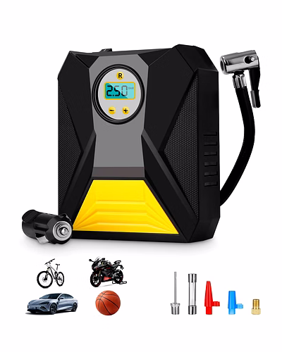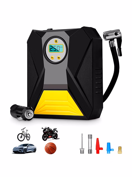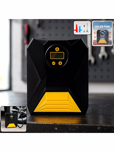 Mini Digital Portable Car Tyre Air Compressor – 12V Auto Cut-Off Inflator with LCD Display, Preset Pressure & Multi-Nozzle Kit for Car, Bike, Balls & Inflatables Description :- Keep your tyres perfectly topped up wherever you are with this compact 12V digital air compressor. The clear LCD lets you preset the target pressure and watch it fill in real time; once the set value is reached, the inflator automatically stops to prevent over-inflation. A rugged body with integrated carry design makes it easy to stow in the boot, while the flexible air hose and quick-connect valve simplify attaching to standard tyre stems. Supplied with additional nozzles, it also handles bikes, balls and other inflatables—an essential tool for safer rides and emergency readiness. Key Features :- Digital LCD readout with +/- buttons for precise preset pressure control Auto cut-off at the set PSI/Bar/KPa value for safer inflation 12V vehicle power operation via standard in-car socket Fast inflation for routine top-ups and roadside emergencies Multi-nozzle kit for car/bike tyres, sports balls and small inflatables Compact, lightweight body for easy storage in glovebox/boot Sturdy housing with anti-slip side textures for better handling Simple single-person operation; low maintenance Ideal For :- Car and two-wheeler owners for routine pressure checks and long trips Emergency roadside kits and highway travel Sports enthusiasts to inflate footballs, basketballs, etc. Home use for inflating toys, small inflatables and cycle tyres Specifications :- Product Type: Portable digital tyre inflator / air compressor Power: 12V DC (vehicle socket) Display: LCD with unit selection (PSI/Bar/KPa) Functions: Preset target pressure with automatic stop Accessories: Standard tyre valve connector + assorted nozzles (ball/utility) Hose: Flexible hose with quick-connect fitting Cable: Vehicle-length power lead (in-car use) Use: Cars, bikes, scooters, sports balls, small inflatables Care: Allow cool-down between cycles; store dry and dust-free Keywords :- mini digital air compressor , portable tyre inflator , auto cut-off inflator , LCD display air pump , preset pressure compressor , multi-nozzle inflator kit , ball inflator , inflatable pump , compact tyre air compressor , portable car pump , digital tyre inflator , versatile inflator for vehicles Dimension:- Vol. Weight (Gm) :- 167 Product Weight (Gm) :- 518 Ship Weight (Gm) :- 518 Length (Cm) :- 16 Breadth (Cm) :- 7 Height (Cm) :- 7