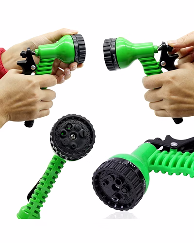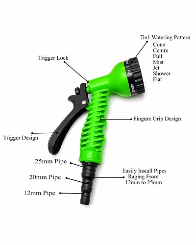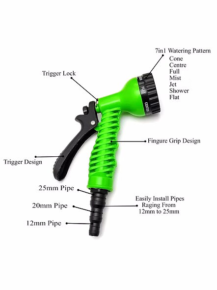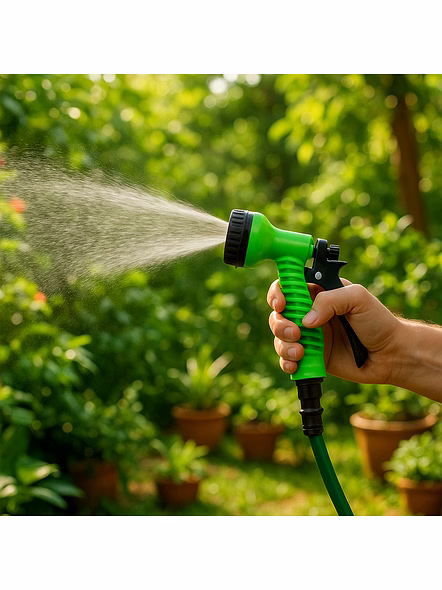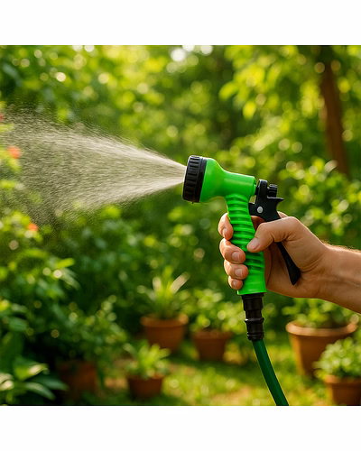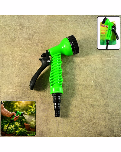 Multi-Pattern Garden Hose Spray Nozzle – Handheld Trigger Sprayer with Flow Control, Adjustable Jet/Mist Modes & Ergonomic Grip for Watering, Cleaning & Car Wash (1 Pc) Description :-Upgrade your watering routine with this versatile handheld spray nozzle. The rotating head switches quickly between multiple spray patterns—from a gentle mist for delicate plants to a strong jet for rinsing pavements and washing vehicles. A responsive trigger delivers precise start/stop control, while the flow adjuster lets you fine-tune output for different tasks. The ergonomic, non-slip grip stays comfortable in wet hands and the leak-resistant connector helps maintain steady pressure. Built for everyday use, it’s a practical attachment for gardens, balconies, courtyards, workshops, and cleaning jobs around the home. Key Features :- Multi-pattern dial: choose mist, shower, cone, flat, jet and more (as available) Trigger operation with optional continuous-spray latch for reduced hand fatigue Flow control to match delicate watering or high-pressure rinsing Ergonomic, textured handle designed for a secure, non-slip hold Leak-resistant hose connector for steady water delivery Durable construction suitable for daily outdoor use Quick to attach/detach; fits standard garden hoses with compatible coupler Ideal For :- Watering plants, lawns, planters and kitchen-garden beds Balcony and patio cleaning, floor and outdoor furniture rinse-downs Vehicle, bicycle and equipment washing Pet areas, kennels, and general outdoor maintenance Specifications :- Product Type: Handheld garden hose spray nozzle Operation: Trigger with flow control and pattern-select dial Connector: Standard hose coupling (use with compatible hose/adapter) Grip: Ergonomic, non-slip handle Care: After use, turn off water at source, release pressure, drain, and store in shade Keywords :- garden hose nozzle , spray nozzle , multi-pattern sprayer , handheld trigger sprayer, adjustable hose nozzle , flow control nozzle , watering tool , garden watering nozzle, cleaning sprayer , car wash nozzle , lawn care tool , high pressure spray nozzle , durable garden accessory , hose attachment , gardening equipment , water control nozzle Dimension :- Volu. Weight (Gm) :- 244 Product Weight (Gm) :- 99 Ship Weight (Gm) :- 244 Length (Cm) :- 18 Breadth (Cm) :- 13 Height (Cm) :- 5
