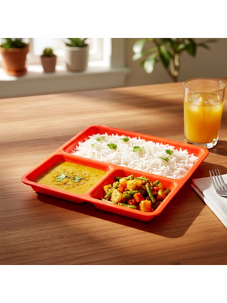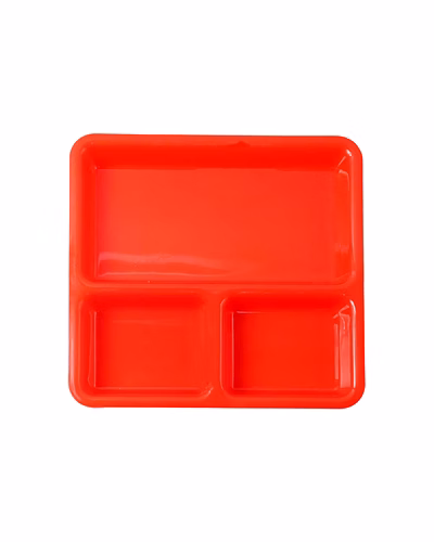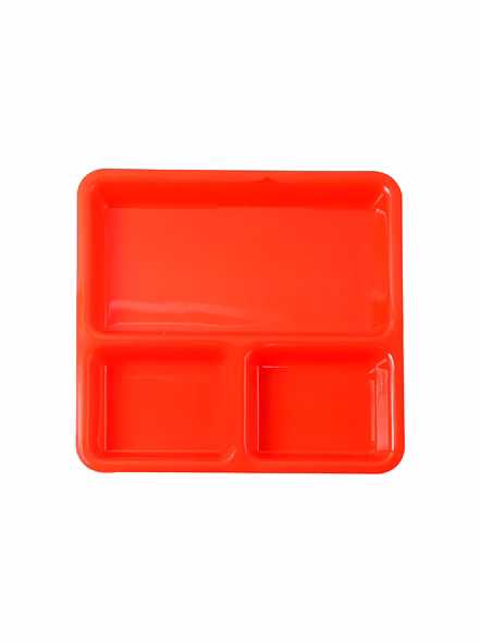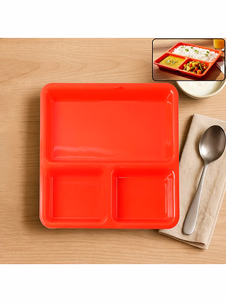 Plastic 3-Compartment Rectangular Meal Serving Tray / Plates – Sectioned Dining Plate for Neat Portioning, Mess-Free Plating & Quick Cleanup (Cafeteria/Thali Style) Description :-Serve a complete balanced meal in one organized tray. This 3-in-1 compartment plate keeps mains and sides cleanly separated so flavors don’t mix and the table stays tidy. The smooth, food-safe surface washes quickly and dries fast, while the raised rim helps contain gravies during self-service and kids’ meals. Light yet sturdy for everyday use, the tray stacks efficiently in cupboards and brings hotel/hostel convenience to home kitchens—perfect for portion control, buffets, and lunch counters. Key Features :- Three fixed compartments for organized plating of mains, sides, and condiments Raised spill-guard rim keeps sauces contained and reduces mess Smooth, easy-clean surface—wipes and washes quickly Durable everyday build suitable for household and canteen service Stackable form to save storage space on shelves and trolleys Lightweight for comfortable handling by kids and adults Ideal For :- Daily home dining and portion-controlled meals Office pantries, hostels, cafeterias, and food courts Party buffets, picnics, and meal-prep plating Serving kid-friendly thalis and snack assortments Specifications :- Product Type: Sectioned meal/serving tray (3 compartments) Form Factor: Rectangular tray with integrated sections Edge Profile: Raised rim to minimize spills Care: Hand wash or gentle dishwash cycle; avoid abrasive pads; store dry Use Environment: Suitable for daily kitchen use; indoor/outdoor dining Keywords :- Plastic 3-compartment tray , Rectangular meal tray , Sectioned dining plate , Multi-compartment serving plate , Portion control tray , Mess-free plating tray , Home and office meal tray , Snack and meal serving plate , Lightweight plastic tray , Organized meal plate, Divided serving tray , Sturdy plastic thali Dimension :- Volu. Weight (Gm) :- 327 Product Weight (Gm) :- 134 Ship Weight (Gm) :- 327 Length (Cm) :- 23 Breadth (Cm) :- 23 Height (Cm) :- 3