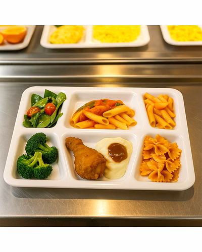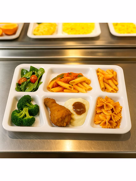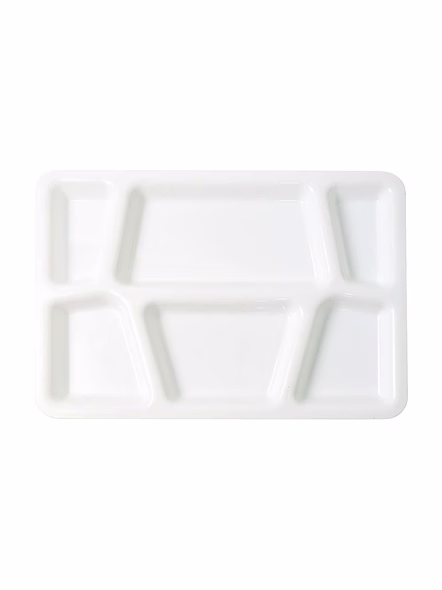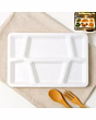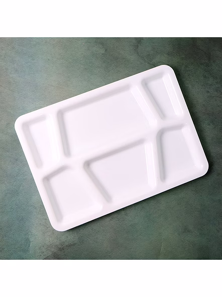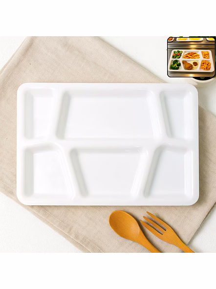 Plastic Multi-Compartment Rectangular Meal Serving Tray – Sectioned Dining Plate for Neat Portioning, Mess-Free Meals & Easy Cleanup - 38x27 Cm (Cafeteria/Thali Style / 6 Comapartment / White) Description :-Serve complete meals in one place with this smart, sectioned serving tray. The thoughtfully sized compartments keep mains, sides, salads, snacks, and dips neatly separated so flavors don’t mix and the table stays tidy. Its smooth, food-safe surface is simple to wash and dries quickly, while the raised edges help prevent spills during self-service or kids’ meals. Light yet sturdy for everyday use, this tray brings hotel/hostel efficiency to home kitchens—perfect for balanced plating, portion control, and streamlined cleanup after mealtime. Key Features :- Multiple fixed compartments to separate mains, sides, snacks, and condiments Raised edges reduce spills and keep sauces contained Smooth, easy-clean surface; wipes and washes quickly Durable build suitable for daily household and canteen use Lightweight for comfortable handling by kids and adults Stackable design saves space in shelves and trolleys Ideal For :- Home dining for kids and adults who prefer organized meals Cafeterias, hostels, tiffin counters, office pantries, and food courts Party buffets, picnics, and festive serving for neat self-service Portion-controlled diets and meal-prep plating Specifications :- Product Type: Sectioned meal/serving tray (multi-compartment plate) Form Factor: Rectangular tray with integrated compartments Edge Profile: Raised spill-guard rim Care: Hand wash or gentle dishwash cycle; avoid abrasive pads; store dry Use Environment: Indoor/outdoor dining; safe for daily kitchen use Keywords :- Plastic multi-compartment tray, Rectangular meal tray, Sectioned dining plate,Portion control tray, Mess-free meal plate, Easy-clean serving tray, Durable plastic tray, Multi-section meal tray, Cafeteria-style plate, Thali-style tray,Plastic portion plate, Divided serving tray, Sturdy plastic thali,Multi-purpose compartment plate Dimension :-Volu. Weight (Gm) :- 626 Product Weight (Gm) :- 281 Ship Weight (Gm) :- 626 Length (Cm) :- 38 Breadth (Cm) :- 27 Height (Cm) :- 3